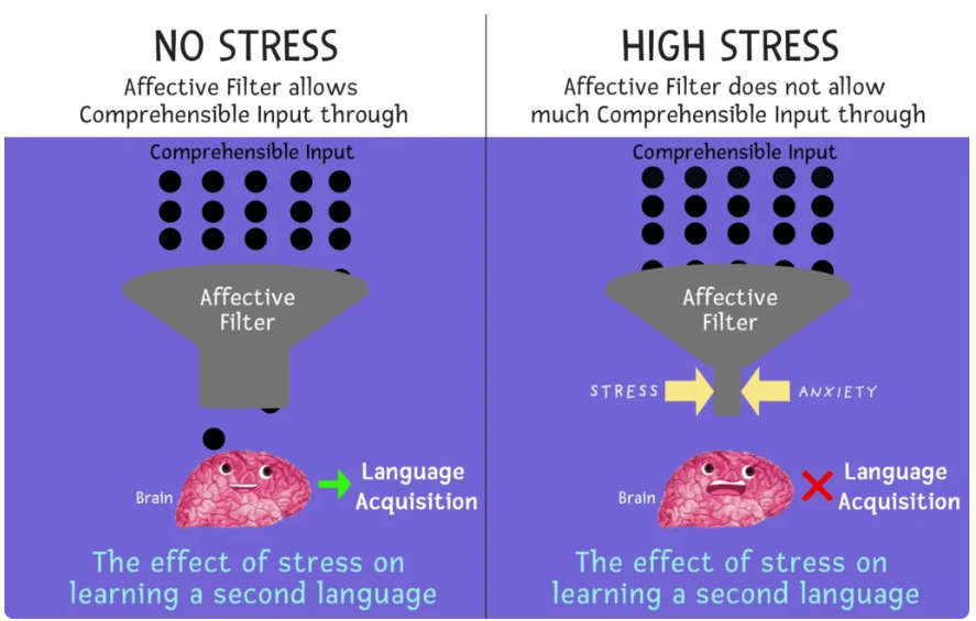 Stephen Krashen’s concept of the affective filter suggests that language acquisition is deeply influenced by emotions. When learners feel anxious, self-conscious, or pressured, their “filter” goes up and acquisition slows. When they feel safe, connected, and relaxed, the filter lowers and language flows in more easily.