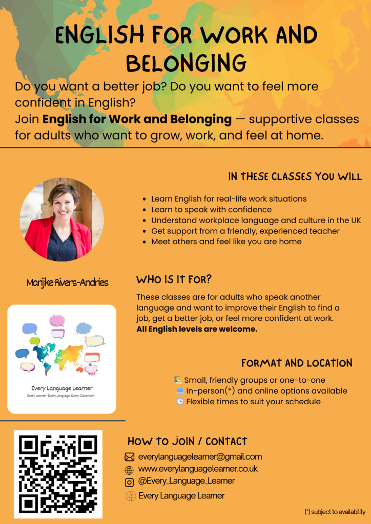 Whether you are looking for your first job, aiming for something better, or just want to feel more at ease using English every day, our classes will help you take your next step with language that empowers, not overwhelms.